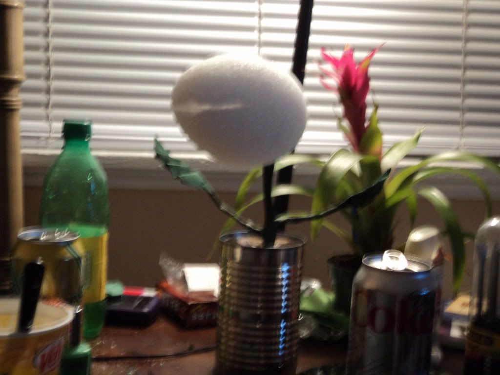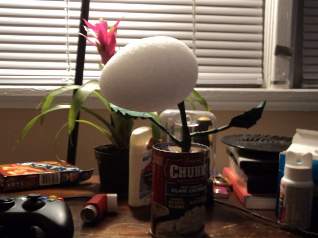 Here he just has his stem and leaves made. It's made out of craft wire, floral tape, and oragami leaves. The head is a styrofoam egg...