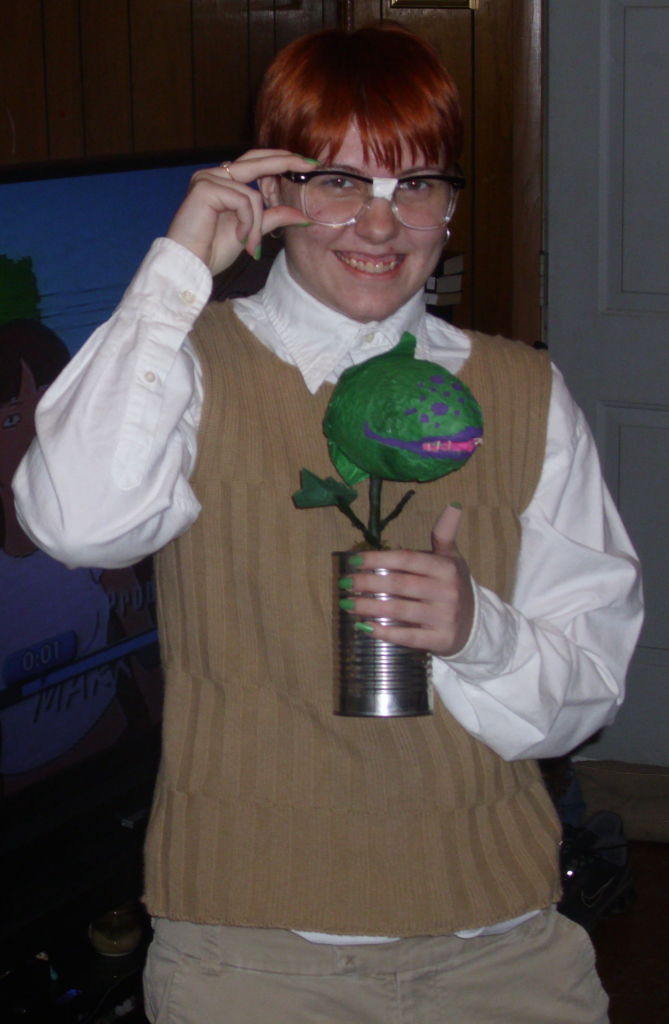LOL, here's the finished costume all for removing my fingernail polish and jewelry. XD WE'RE GETTING CLOSER. Poor Audrey II lost a leaf though, I'll have to glue it back on...